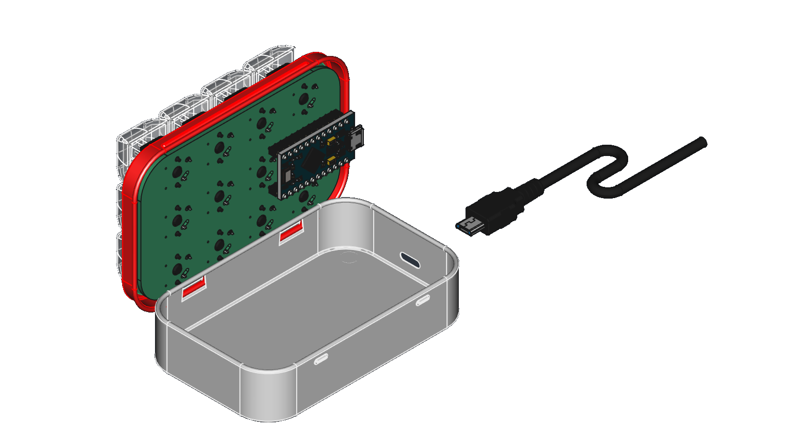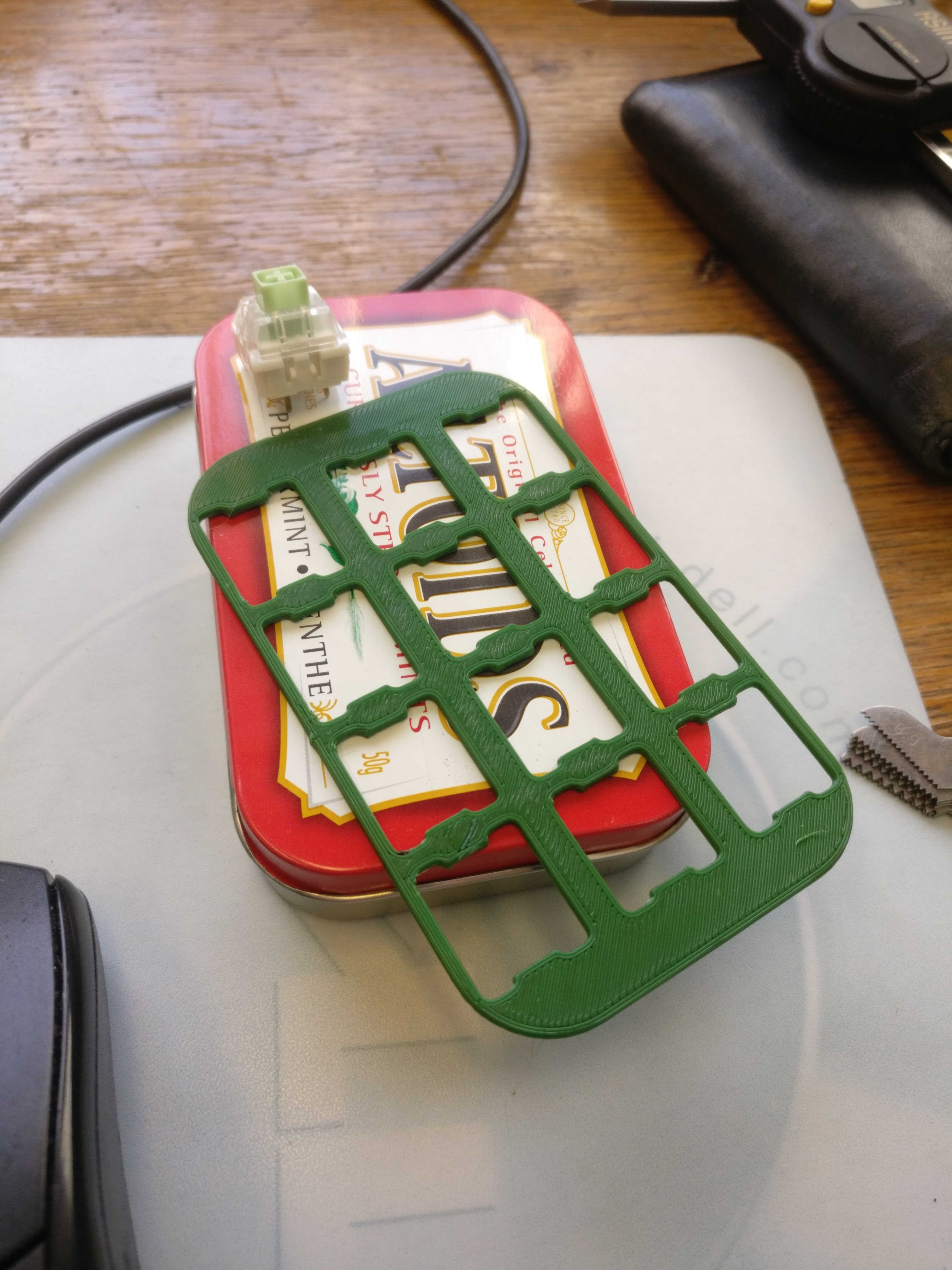 3D printed plate, the mint tin sheet metal is too thin to securely hold the switches.
