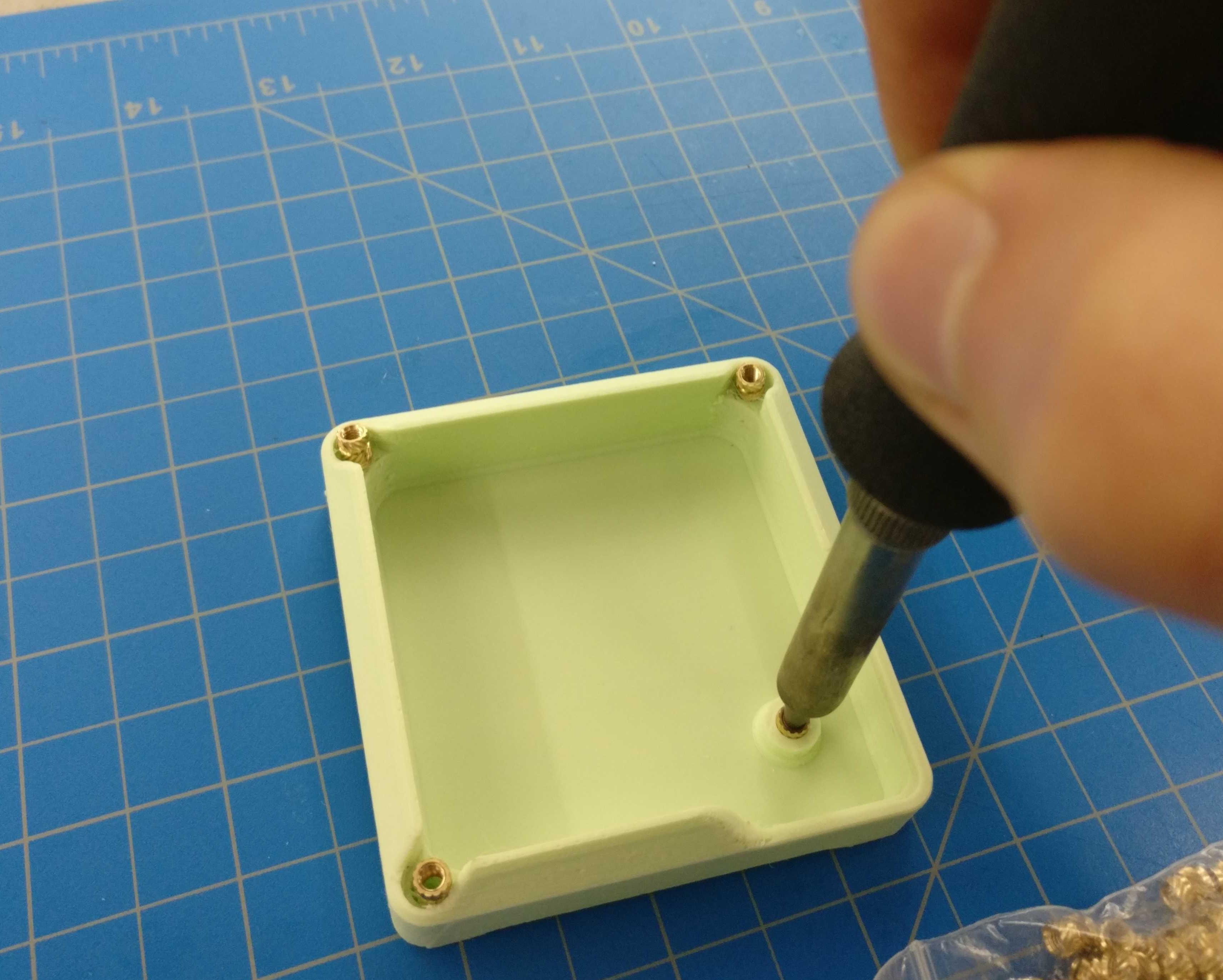 While you are at the soldering iron station, use the iron tip to press the heat-set inserts into the 3D-printed plastic case. All of the brass inserts should be pushed in from the top side, and should be inserted until they are just flush with the surface of the 3D print. Do this step carefully, making sure not to melt too much of the plastic.