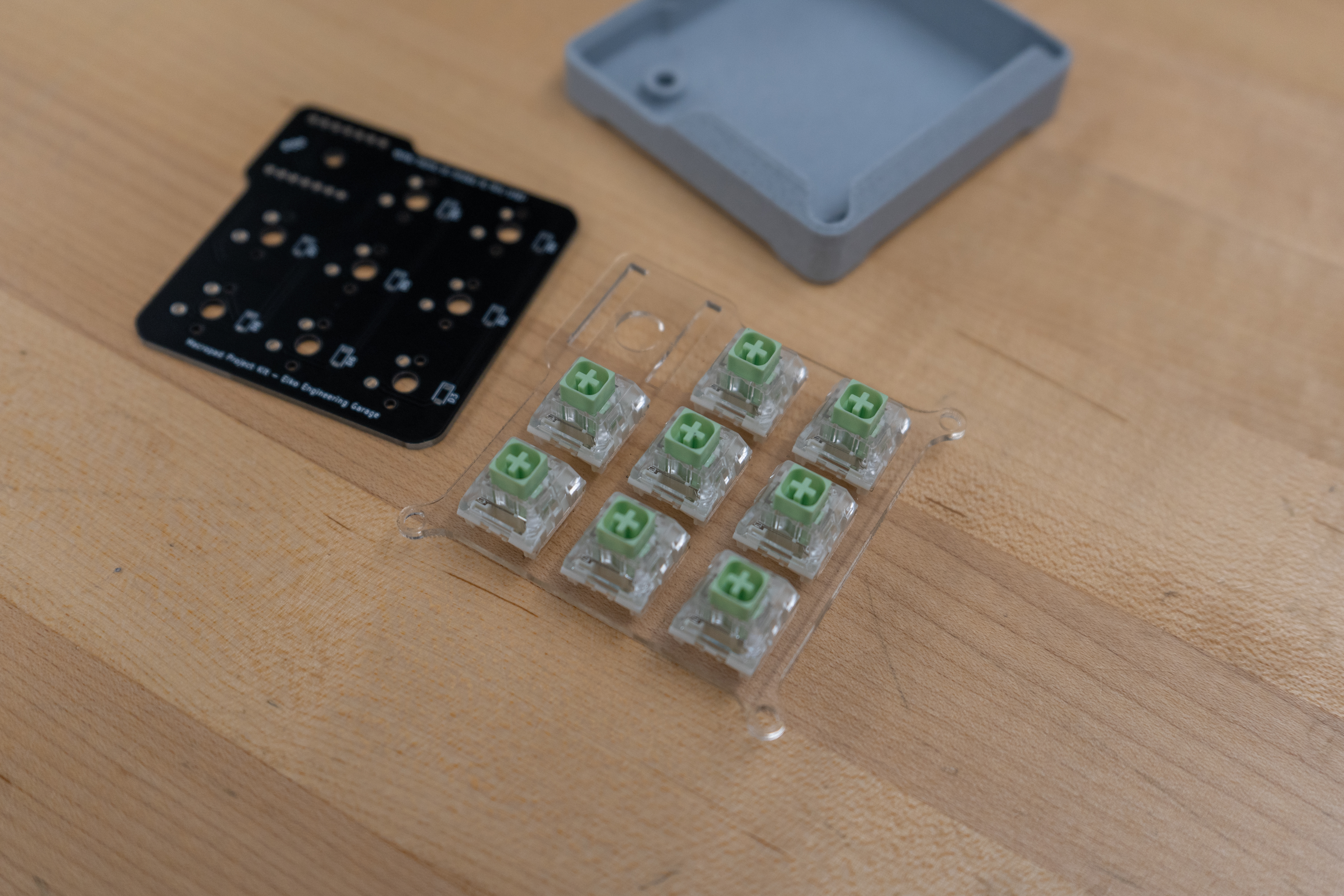 At this point, you should have a case and an acrylic plate. Let’s get it all assembled! First, press the switches through their matching holes in the acrylic plate. Make sure to remove the protective film from the acrylic before adding the switches. The holes are square, so you’ll need to get each switch in the correct orientation.