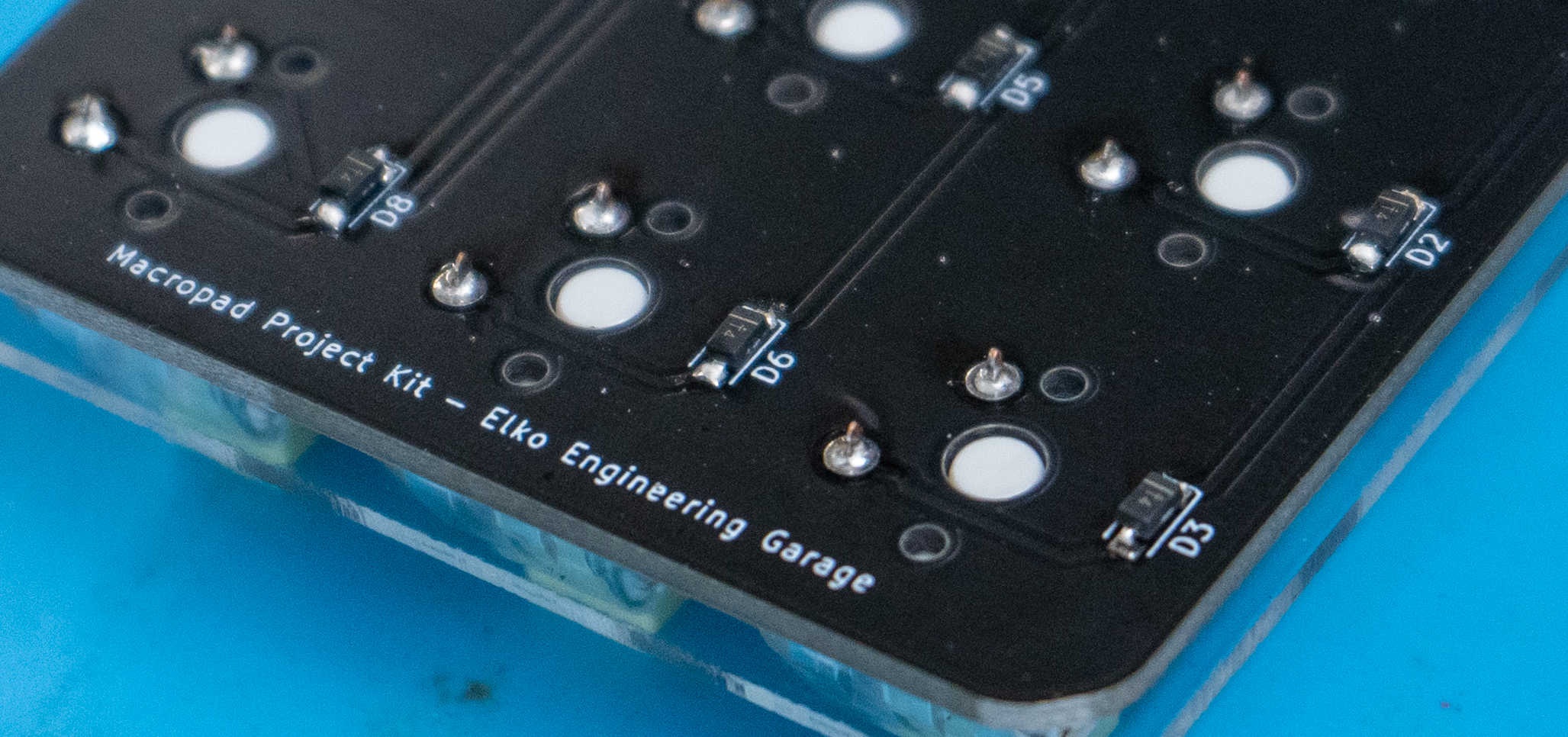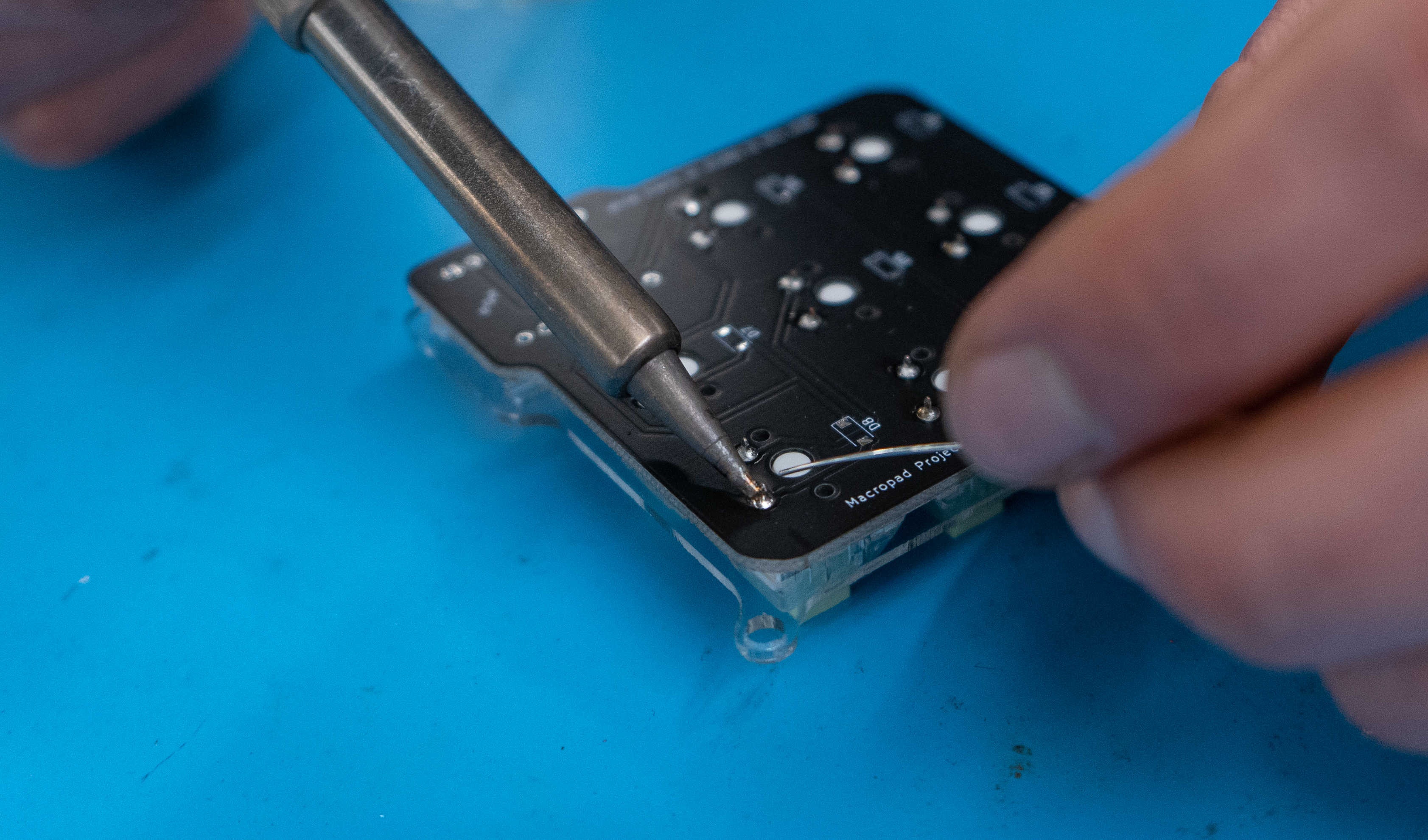 The final components we need to solder are the diodes. They are supplied to us in a surface-mount-technology (SMT) form factor. This style of component is extremely common in newish electronics, because they are smaller and cheaper. For assembly by hand, however, they are slightly more challenging to solder. Note that the diodes also have a polarity, so you’ll need to orient the small white mark on each component to the side indicated by the text on the PCB. Soldering up all 8 diodes will be a bit of a challenge, but it’s a great way to build your soldering skills. A few extra diodes are included in the kit in case you misplace one. Our suggested technique for soldering SMT components is as follows: